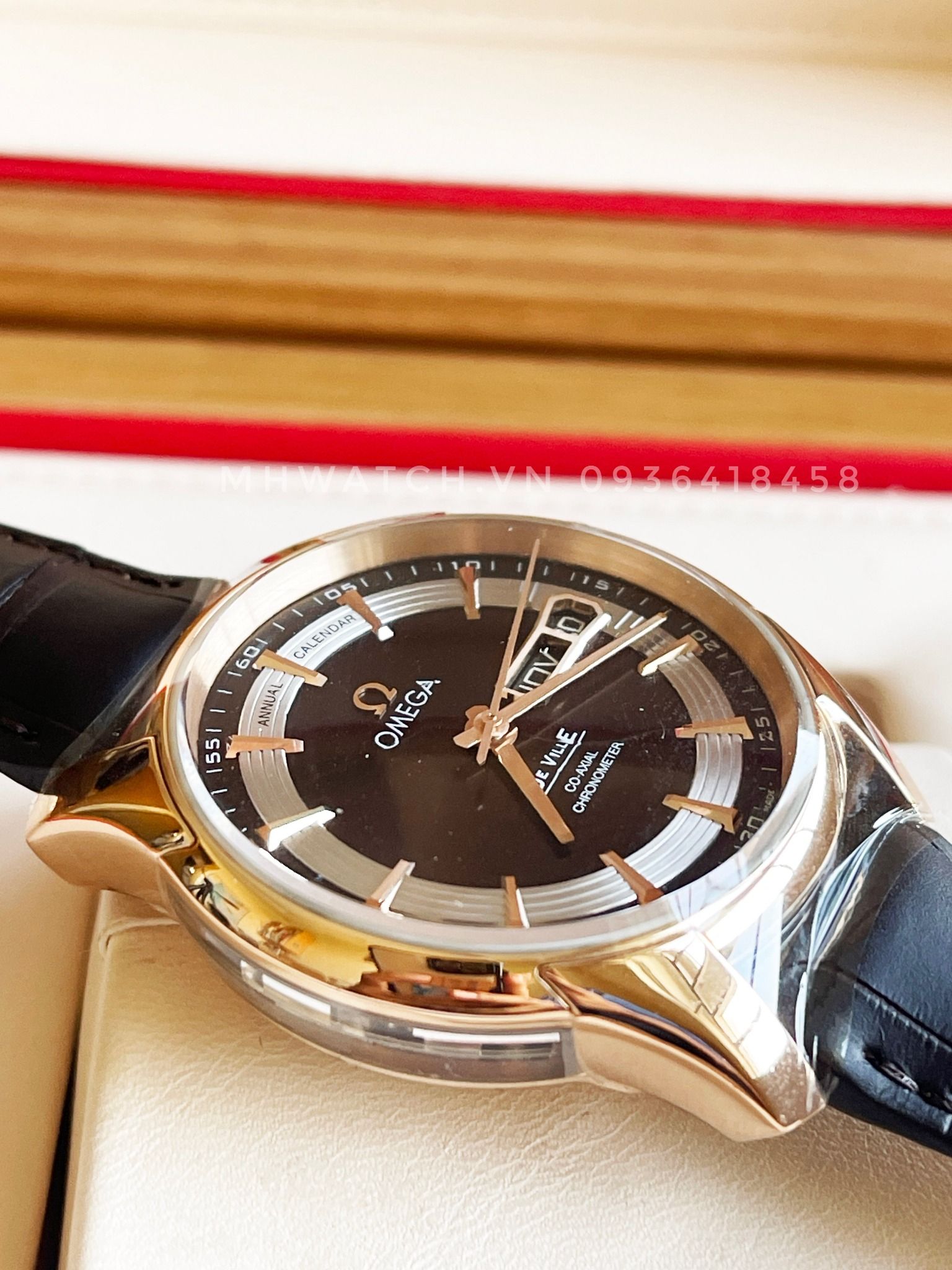 - Khóa: Vàng đúc 18k, Dây da nâu cá sấu, mặt màu chocolate